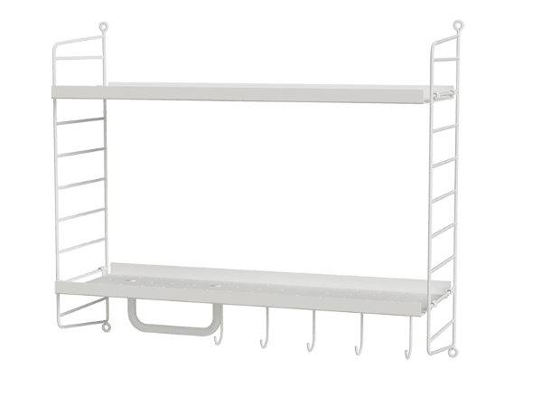 Badeværelset- Kombination E væghængte badeværelsesmøbel er perfekt til de mindste badeværelser. Kombinationen har kun to hylder, hvilket gør det muligt at opbevare højere genstande. På den nederste hylde er der tilføjet kroge og en stang for at øge opbevaringspladsen. Her kan du nemt hænge dine håndklæder. String Furniture har udviklet flere kombinationer af reoler til opbevaring, til hele hjemmet.