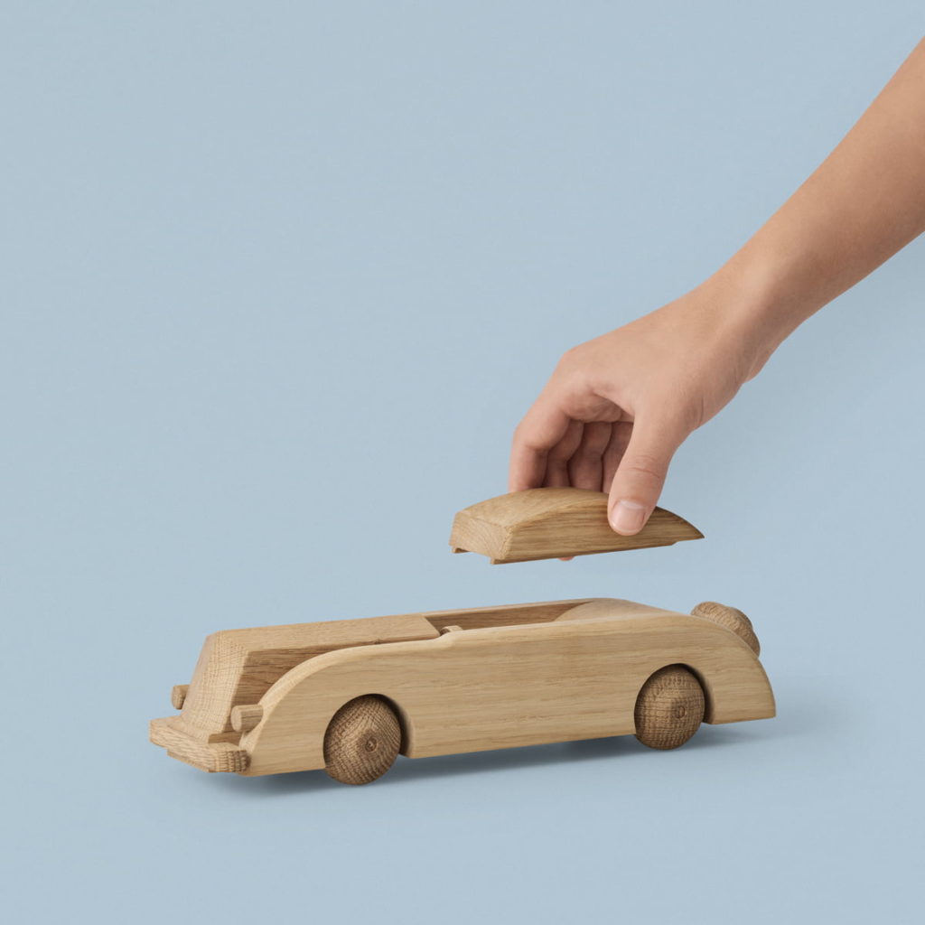 Stor limousine i lys, ubehandlet eg fra Kay Bojesen. Limousinen måler 32 cm i længden. Kay Bojesen var forud for sin tid, da han begyndte at producere moderne og tidløse legetøjsbiler i 1930’erne og 1940’erne. Den smukke limousine har han designet i samarbejde med Ole Wanscher, og den kan ligesom de elegante, strømlinede biler fra denne tid fjerne taget. Løft taget af, og omdan legetøjsbilen til en fræk cabriolet eller en eksklusiv limousine.