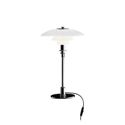 Denne PH 3/2 Bordlampe er designet af Poul Henningsen for Louis Poulsen. Lampens stel er lavet i højglansforkromet.