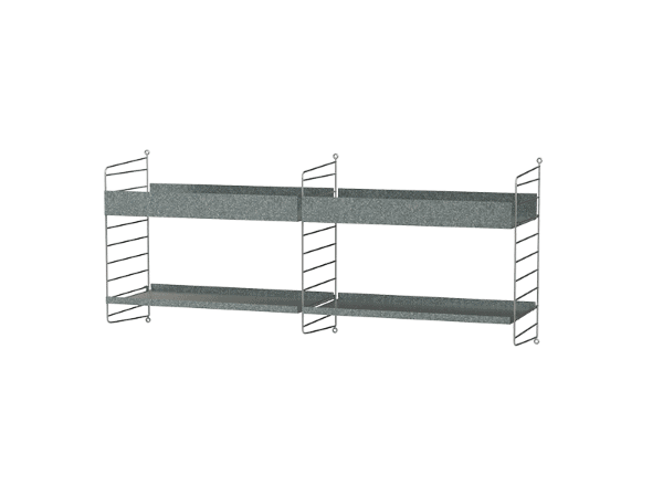 String Udendørs - Kombination F er en lækker sektionskombination som er beregnet til udendørsbrug. Reolsystemet har galvaniseret paneler og hylder, som vil ændre sig med tiden. String Furniture har udviklet flere kombinationer af reoler til opbevaring, til hele hjemmet - Vi har et stort udvalg af dem.